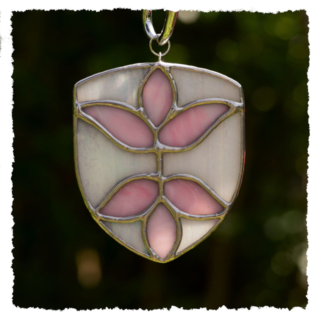 Écusson à suspendre. Rose et blanc irisé, le tout est opalescent.